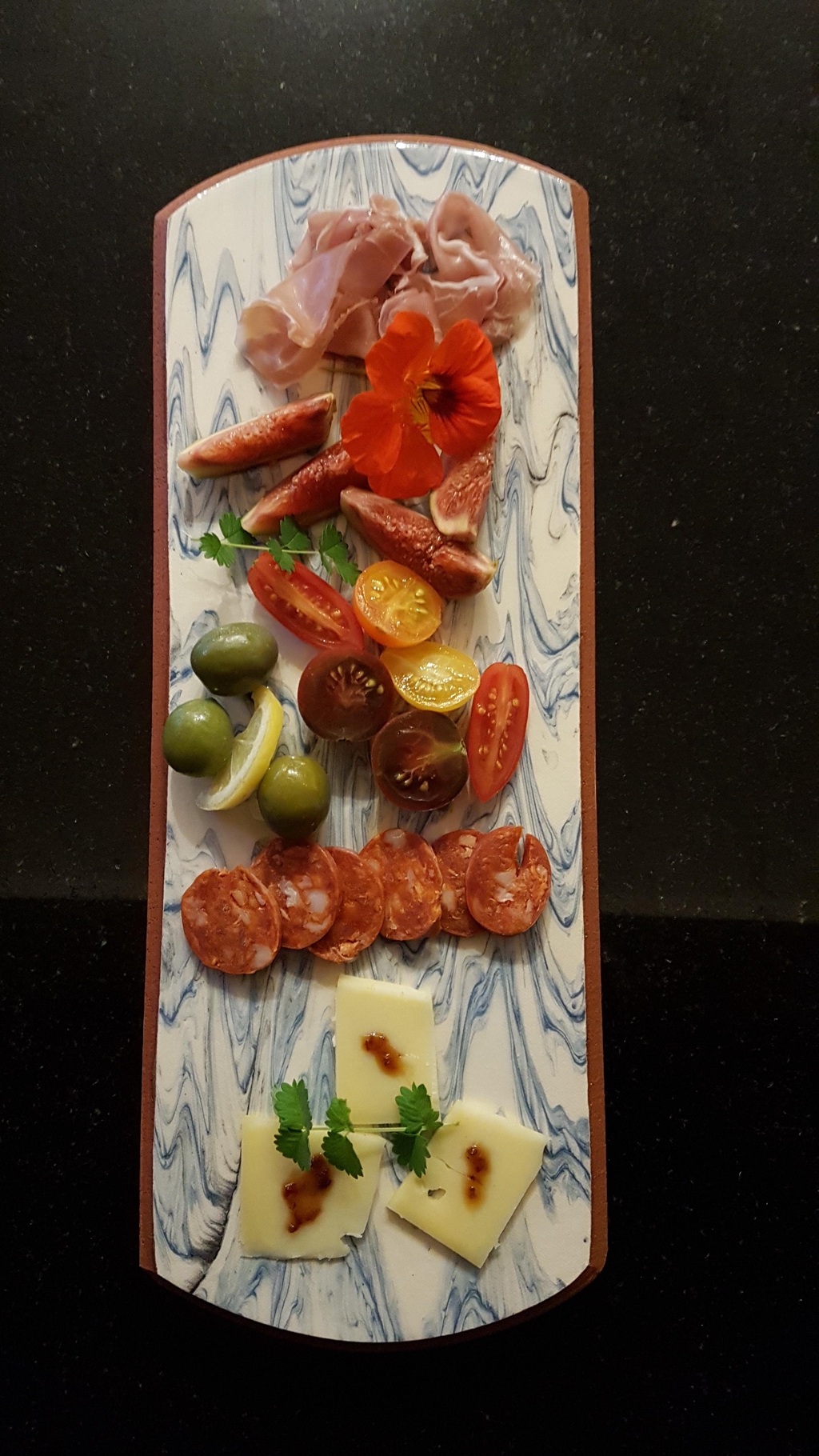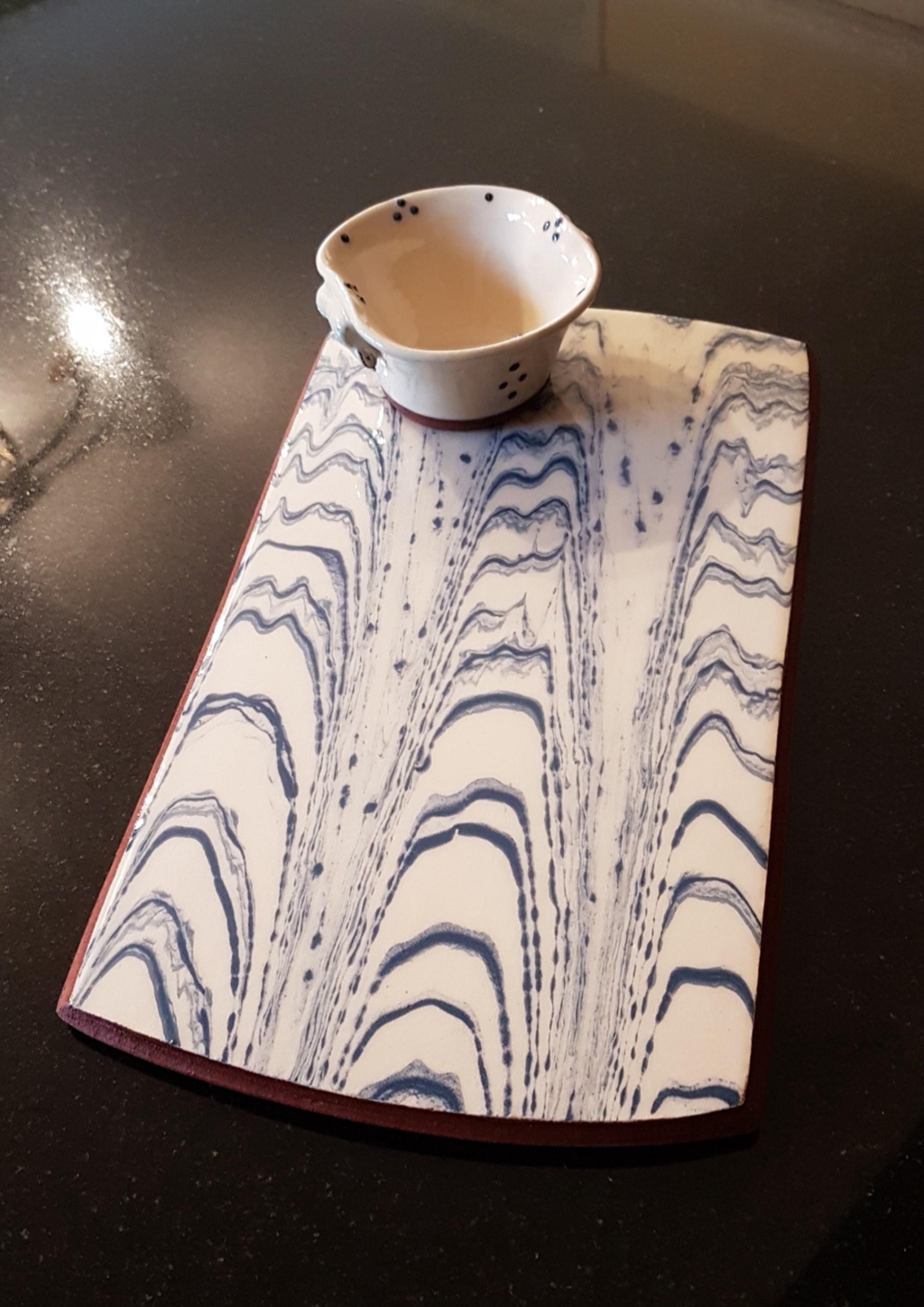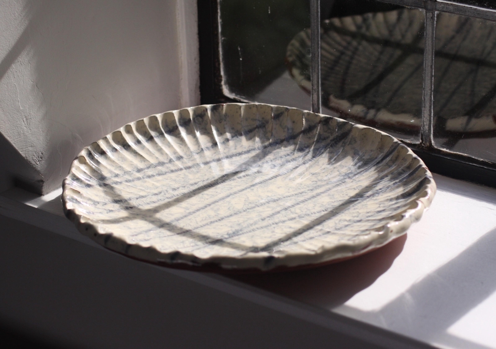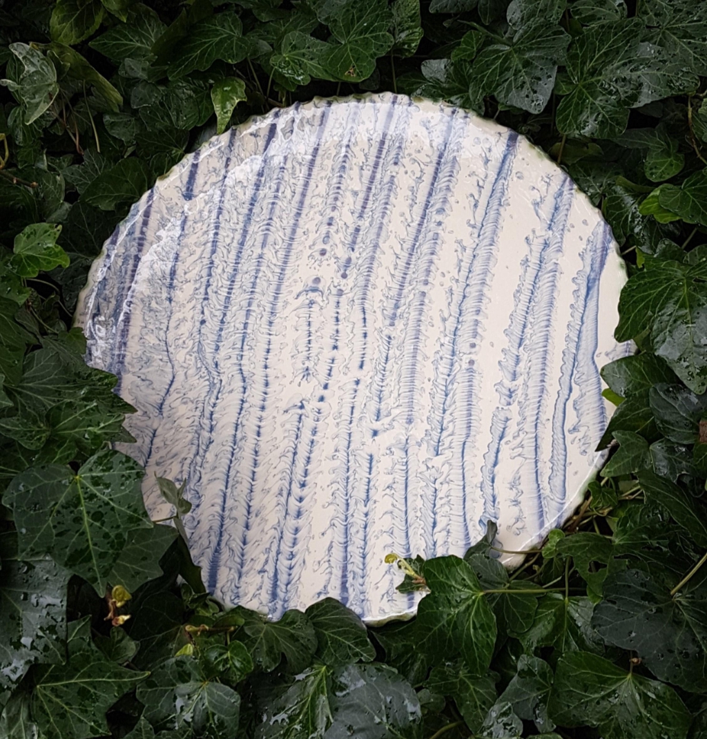 Having been a marine geologist in a past career the influence of the marine environment is evident in my work. I use coloured liquid clay (slip) which provides a fantastic fluid palette for me to explore the patterns that nature produces, displayed in metamorphic and sedimentary strata and, particularly in marine geomorphology, such as the drawing back of silt by the waves on a sandy shoreline.